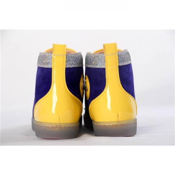 Update your red sole sneaker collection with "Lou Spikes Flat" in this vibrant palette of cubiste patent leather and purple pop suede with 'disco ball' inset glitter. This coveted Louboutin hightop silhouette features a signature silver spiked toe box and the CL logo on its interior side.