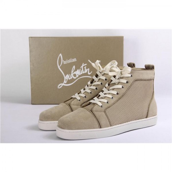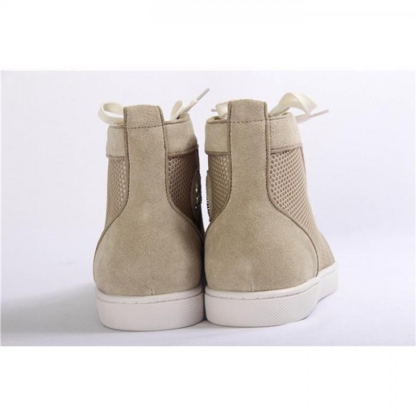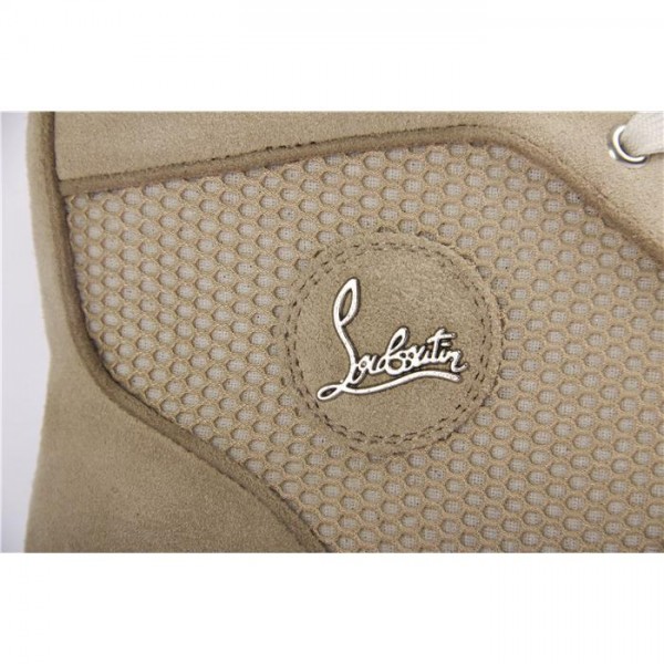 "AC Louis Flat" features ventilating side panels of cool mesh and fishnet. Crafted for barefoot wear, this 'air conditioning' "Louis" in galet suede is a warm weather update on the iconic Christian Louboutin hightop.