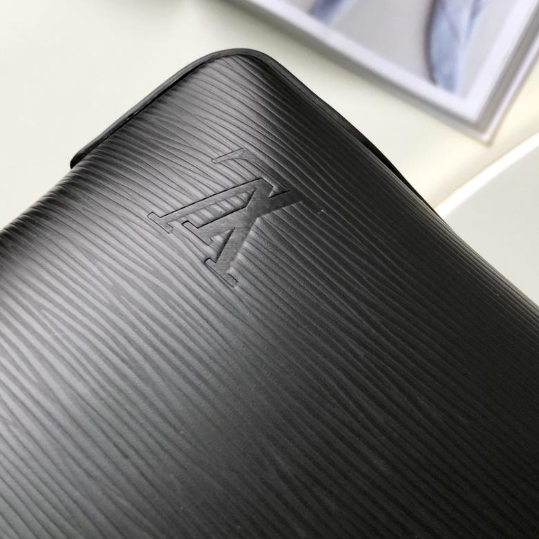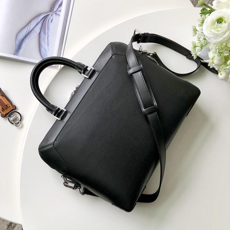 With this plain black brief case bag, office wear would have been taken a notch higher. The bag has 2 carrying options. Either the handles, or the removable and adjustable shoulder strap. The handles and the straps are made of leather. The metalware on this bag are silver. The interior has one unzzipped pocket. Besides, a leather Louis Vuitton tag is stitched on its inside.